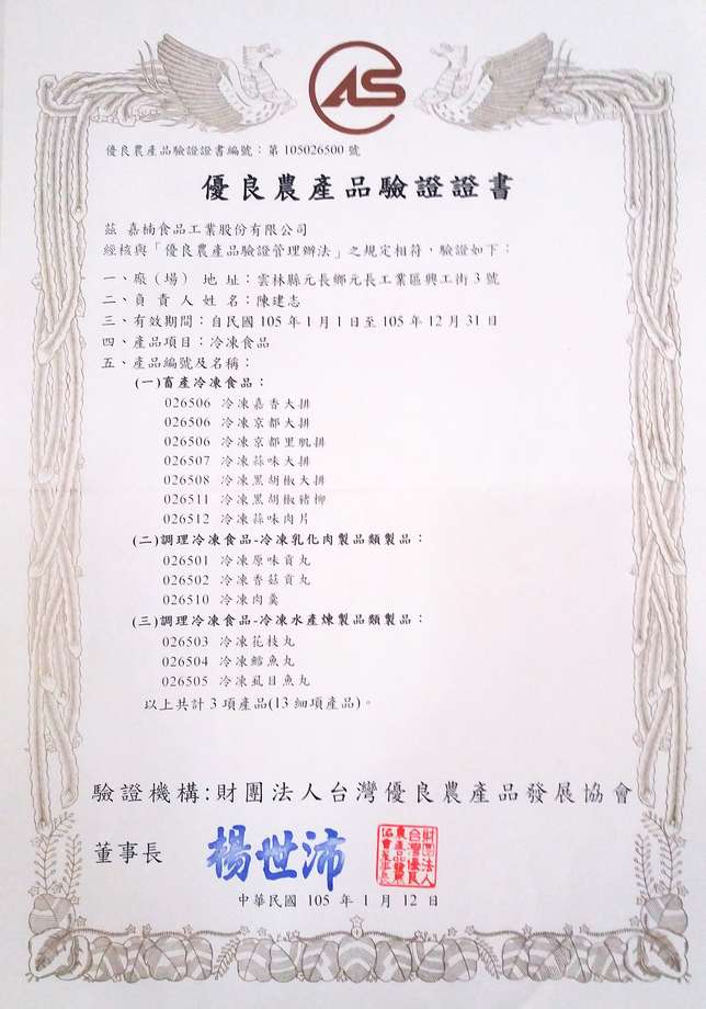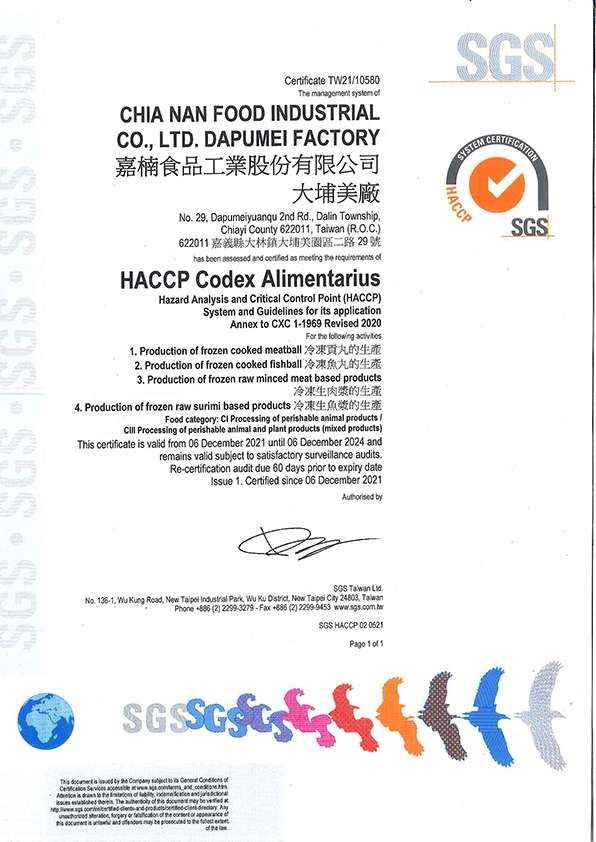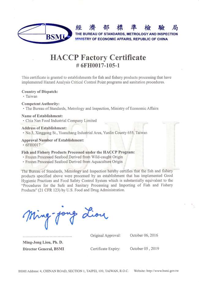 HACCP Certificate of Bureau of Standards, Metrology & Inspection, M.O.E.A, Taiwan