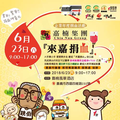 2018 Enterprise Charity Blood Donation(Chiayi) Dates:2018/6/23(sat) 9:00~17:00 Venue:嘉義風華酒店 Prize:Chia Nan Group Coupon 0 協辦單位:嘉義市議會 郭明賓副議長 服務處協辦