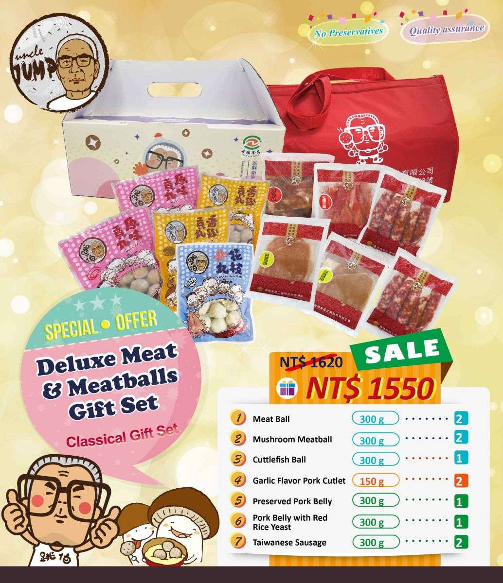 1.Meat ball (300g) * 2 pack2. Mushroom meatball (300g) * 2 pack3. Cuttlefish Ball (300g) * 1 pack4. Garlic Flavour Pork Cutlet(150g)*2 pack5. Perserved Pork Belly (300g) *1 pack6. Pork Belly with Red Rice Yeast (300g) *1 pack7. Taiwaness Sausage (300g) *2 pack -