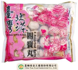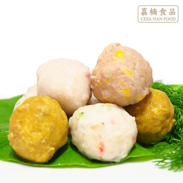 Curry Meat Balls, Corn Meat Balls, Taro Fish Ball, and Celery Fish Balls. -